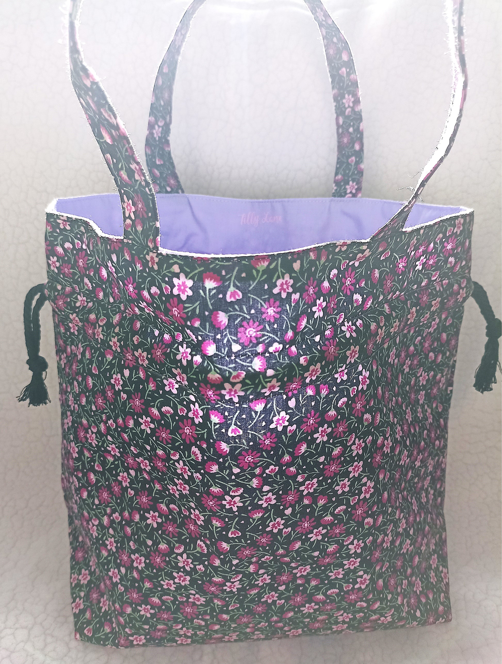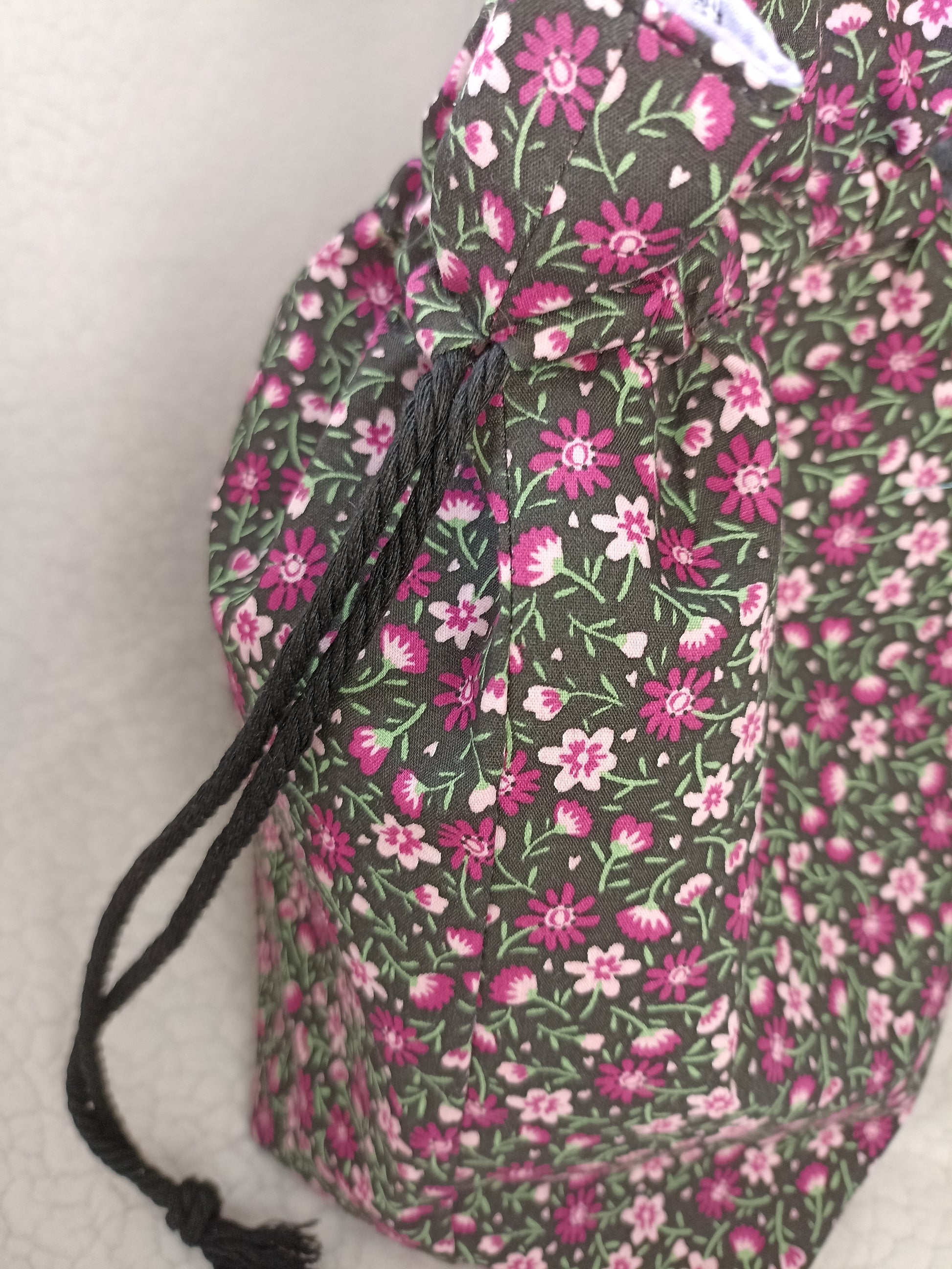 Black With Dainty Pink Purple Flowers Drawstring Bag Unique Durable Gift For Her Sustainable Fashionable Fully Lined With Inside Pocket