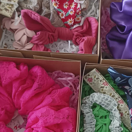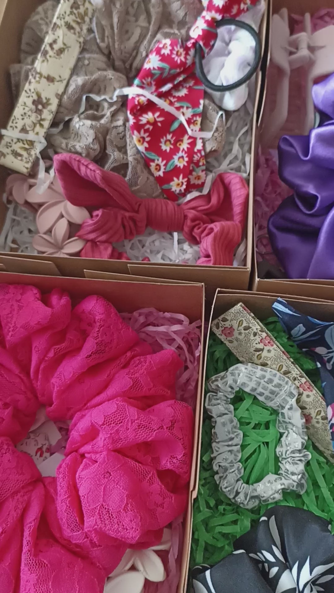 We have 12 of these boxes ready to help us clear stock. The gift box contains at least ten items from my shop. One Xl hair scrunchie, one hair claw and at least eight other hair items.